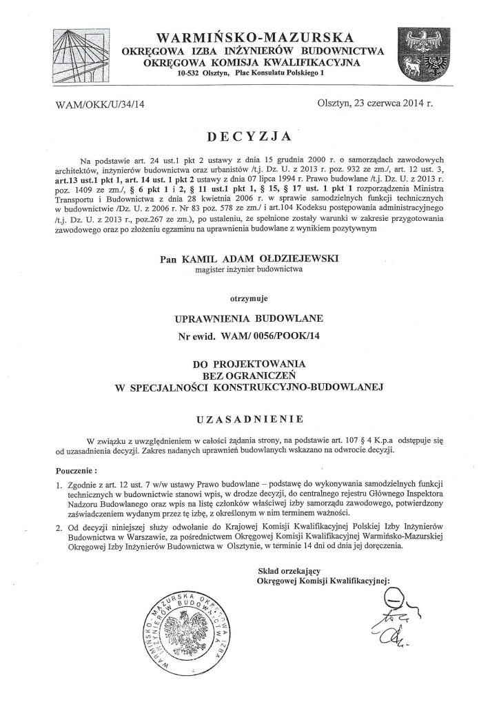 Konstruktor Kamil Ołdziejewski z REKO Olsztyn jest wykwalifikowanym specjalistą, który posiada wszelkie wymagane dokumenty oraz uprawnienia do projektowania i nadzorowania prac budowlanych. Zdobyte przez niego certyfikaty i licencje na drodze kariery zawodowej gwarantują profesjonalizm oraz pracę z najwyższymi standardami branżowymi.
